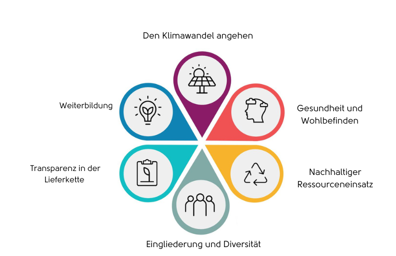 Unser Weg zur Nachhaltigkeit stützt sich auf sechs wesentliche Säulen, wovon jede für unser Ziel, eine nachhaltigere Zukunft zu schaffen, maßgebend ist.