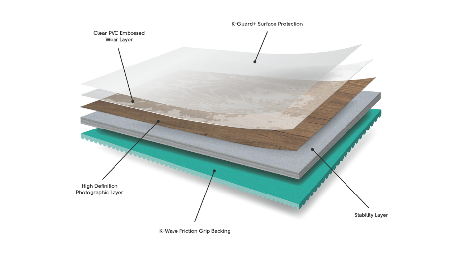 LooseLay Originals vinyl planks and tiles are designed to stand up to the comings and goings of even the busiest households – kids, friends, pets and all the happy mess and chaos of life well lived. A multi-layered design includes the K-Guard+ surface protection system. K-Guard provides a commercial-grade, protective top layer for outstanding resistance to scuff marks, stains and fine scratches to keep floors looking good for longer.