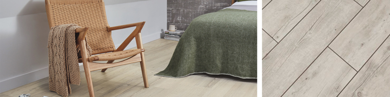 W tej sypialni podłoga Grey Scandi Pine z kolekcji Rubens ma rustykalną, naturalnie przebarwioną fakturę z wyraźnymi słojami i charakterystycznymi sękami. Połączenie subtelnej kolorystyki tej jasnej podłogi z chłodnym neutralnym odcieniem na ścianach oraz meblami z jasnego drewna stworzyło nowoczesny rustykalny styl, który doskonale sprawdza się w miejscach relaksu.